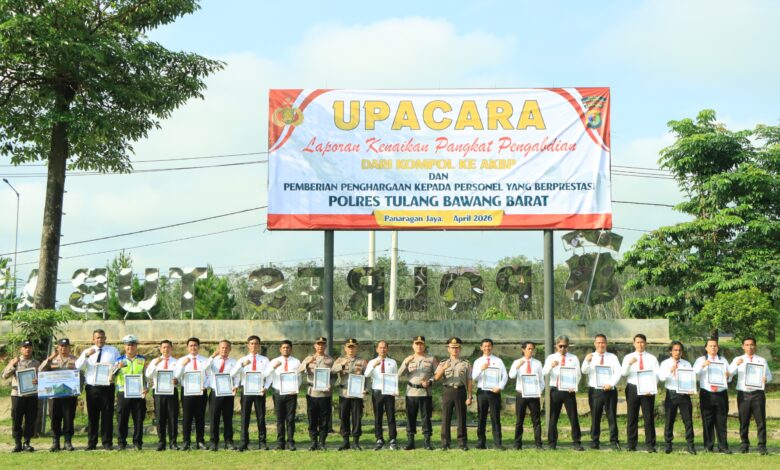Hariansinergi.com, Tulang Bawang Barat- Polres Tubaba Polda Lampung melaksanakan upacara kenaikan pangkat pengabdian bagi perwira Polri setingkat lebih tinggi dari Komisaris Polisi (KOMPOL) Menjadi Ajun Komisaris Besar Polisi (AKBP) dan Pemberian Penghargaan bagi Personel yang Berprestasi serta Pemberian Reward Umroh Personel bertempat di Lapangan Upacara Mapolres Tubaba. Selasa (31/03/2026).