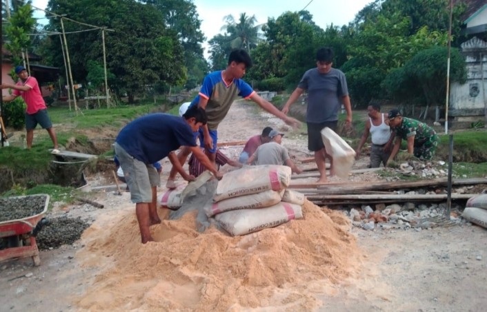 Dalam kegiatan ini, Serma Susilo bersama warga setempat bahu-membahu mengerjakan pembangunan sebagai bentuk kepedulian terhadap sarana infrastruktur desa.